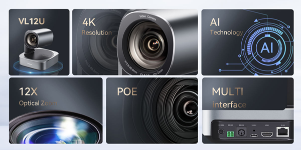 - Zoom quang học 12x: Với khả năng zoom quang học mạnh mẽ, camera có thể phóng to hình ảnh một cách rõ nét mà không làm giảm chất lượng hình ảnh, phù hợp cho việc hiển thị cận cảnh các tài liệu hoặc người thuyết trình.