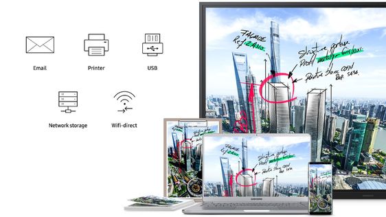 Samsung mang đến nhiều tùy chọn kết nối linh hoạt như USB, HDMI, DP< NFC, chia sẻ màn hình và khe OPS (mini PC) được bổ sung gần đây, cho phép người dùng truy cập dễ dàng vào flip từ nhiều thiết bị khác nhau. Thông qua khả năng trình chiếu liền mạch nội dung từ phía sau của Flip, giáo viên có thể tập trung truyền đạt tối đa, giúp thu hút sự chú ý của học sinh đối với bài giảng.