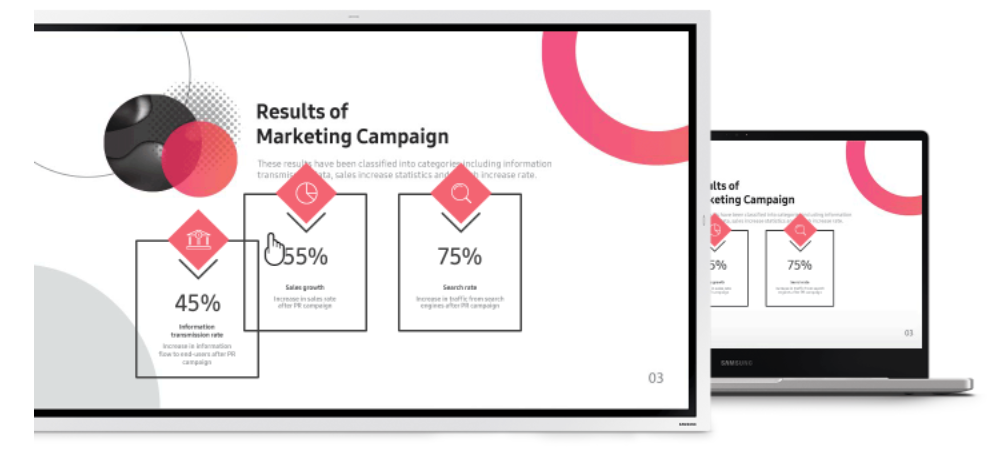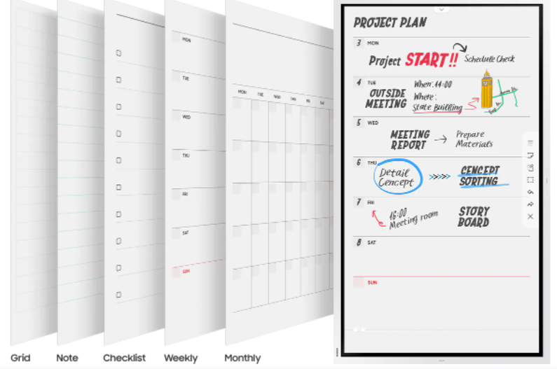 Bạn có thể lựa chọn các định dạng mẫu được tích hợp sẵn trên màn hình tương tác Samsung Flip cho các nhu cầu khác nhau. Không đơn giản chỉ là chức năng viết vẽ thông thường mà thiết bị này còn cho phép bạn sử dụng các tính năng lên lịch làm việc, lịch trình, ghi chú thông tin quan trọng hay ý tưởng hay và dễ dàng kiểm tra danh sách cần thiết. Chính nhờ vậy, Samsung Flip thỏa mãn được mọi nhu cầu kinh doanh và mang đến giao diện hiển thị đúng như ý muốn của từng doanh nghiệp.