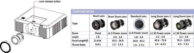 - Tỷ lệ nén: 1.4(wide)~2.6(tele) (100”@3,10m)