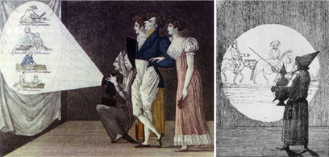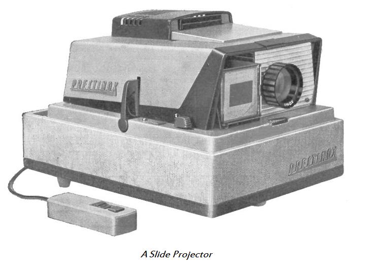 Một trong những máy chiếu sớm nhất trở nên phổ biến trong thời đại này là máy chiếu kính ảnh. Những máy chiếu này được sử dụng để chiếu các ảnh trong suốt lên màn hình. Ánh sáng từ một nguồn như bóng đèn sợi đốt hoặc ánh đèn sân khấu được chiếu thẳng vào ống kính 35mm qua một thấu kính ngưng tụ bằng cách sử dụng gương phản xạ. Tia sáng truyền qua tấm trượt lên thấu kính hội tụ chiếu lên màn ảnh một ảnh lớn. Các trang trình bày có hình ảnh gia đình hoặc tài liệu giáo dục. Máy chiếu kính ảnh đã trở nên phổ biến trong các cơ sở giáo dục cũng như gia đình trong thập kỷ này.