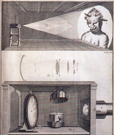 Vào khoảng năm 1756, nhà vật lý và kỹ sư người Thụy Sĩ Leonhard Euler đã phát triển ra máy chiếu máy chiếu phản xạ(còn được gọi là máy chiếu cản quang). Một hình ảnh hoặc một vật thể được đặt bên trong máy chiếu. Ánh sáng từ đèn sáng đặt phía trên vật chiếu ảnh của vật lên màn quan sát qua hệ gương và lăng kính.