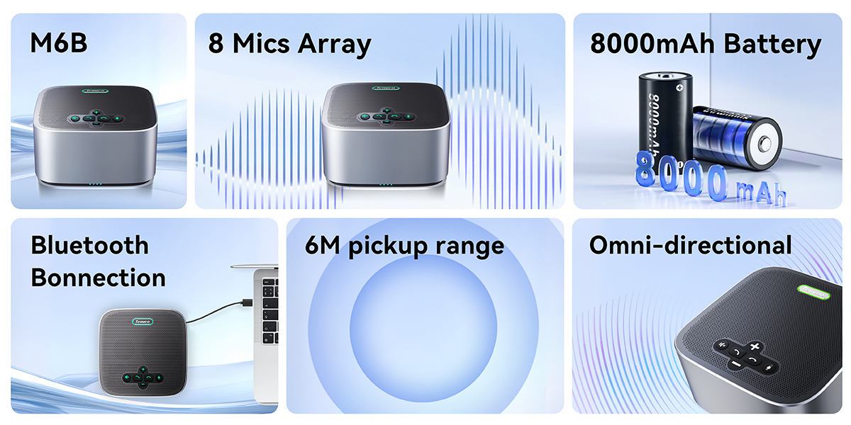 Với 8 micro đa hướng tích hợp, thiết bị đảm bảo mọi người trong phạm vi thu âm từ mọi góc độ đều có thể nghe và được nghe rõ ràng.